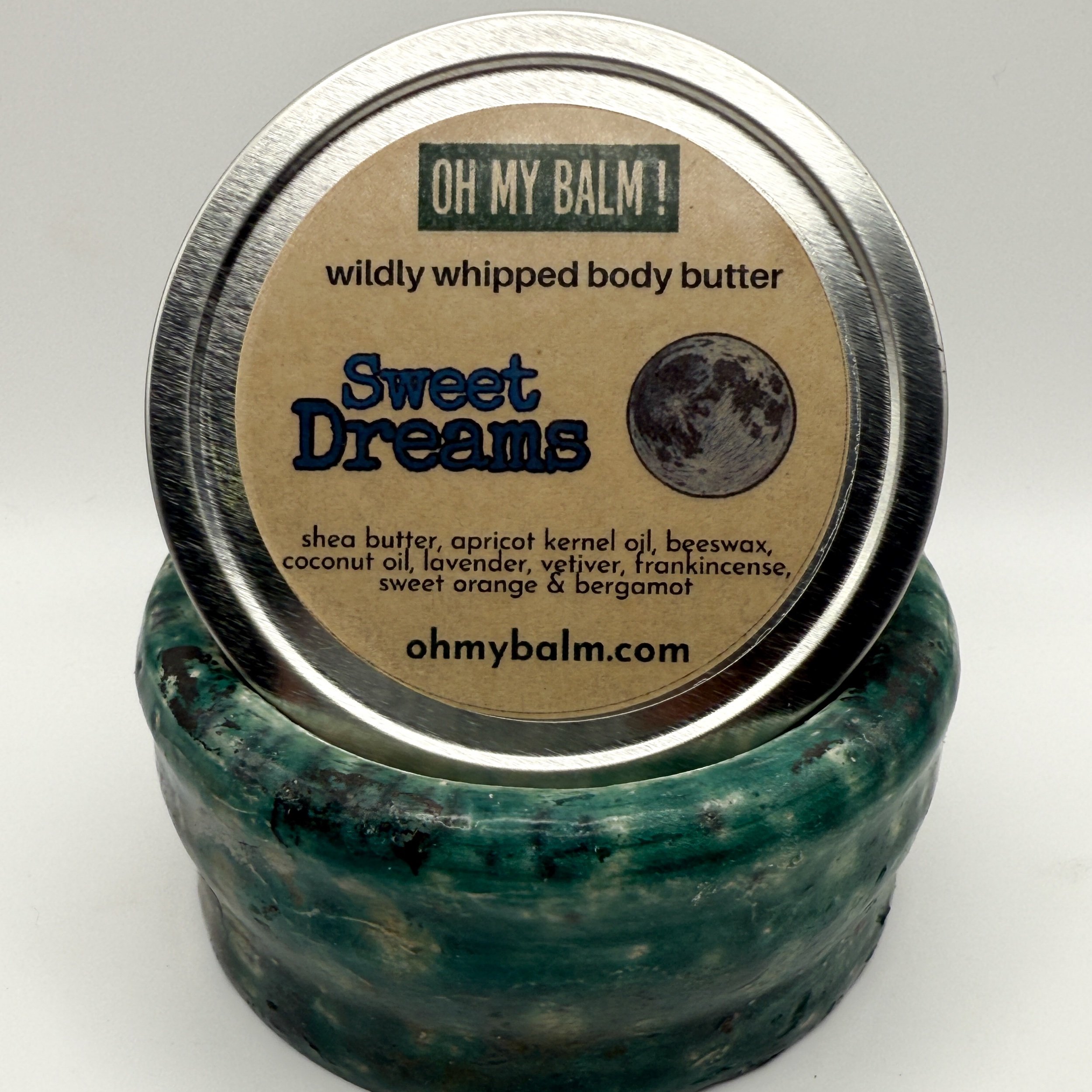 These butters aren’t whipped up in some giant factory — they’re whipped by me, my poor collection of overworked mixers, and a whole lotta love. Every 4 oz, tin is all-natural, made with shea butter, coconut oil, apricot kernel oil, and beeswax (for that protective hug your skin craves). Sometimes cocoa butter shows up to the party, too. Only the good stuff: quality carrier oils + therapeutic grade essential oils. Nothing fake, nothing funky — just whipped until my mixers threaten to quit.